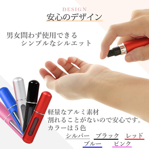 香水ってついつい買い足しちゃう事ありませんか?シルバー・ブラック・レッド・ブルー・ピンクの5色展開なので、香りによって色の使い分けもできます。